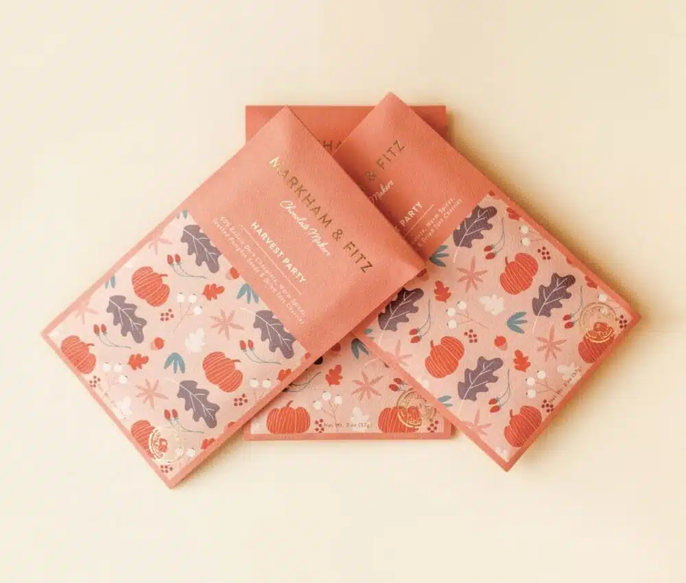 Custom chocolate packaging allows brands to express their uniqueness through materials, colors, and design elements. Markham & Fitz’s choice of a warm peach-orange hue for their Harvest Party bar differentiates it from their classic white packaging, creating an instant seasonal appeal.