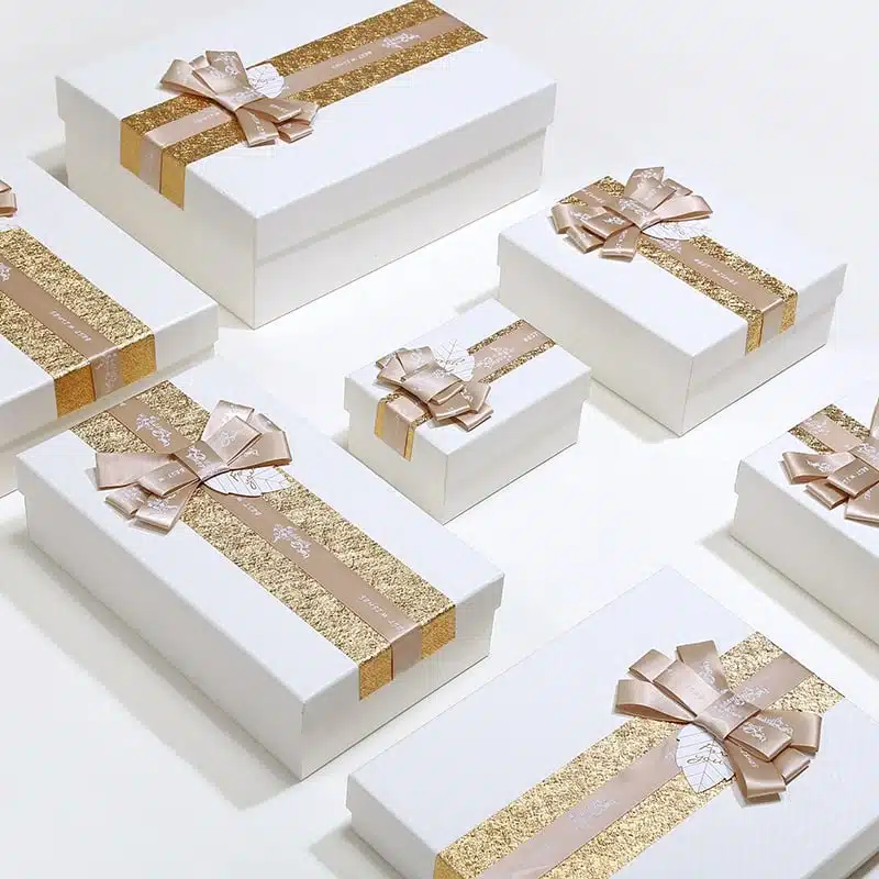 A Luxury Nesting Rigid Gift Box with Bows adds a refined touch to any gift packaging. The addition of a satin, velvet, or organza bow enhances the presentation, making it perfect for weddings, corporate gifts, and luxury products.